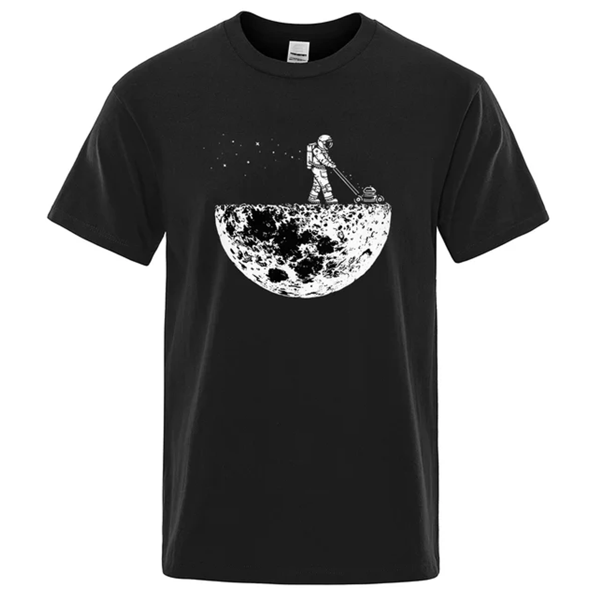 A Camisa AstroLawn apresenta uma estampa única que combina elementos do espaço sideral com uma cena surrealista. No centro da camisa, um astronauta é retratado cortando metade da lua com um cortador de grama, criando uma imagem divertida e intrigante. Esta representação inusitada provoca uma mistura de admiração pelo espaço e humor surreal.