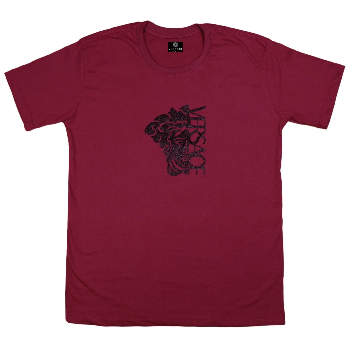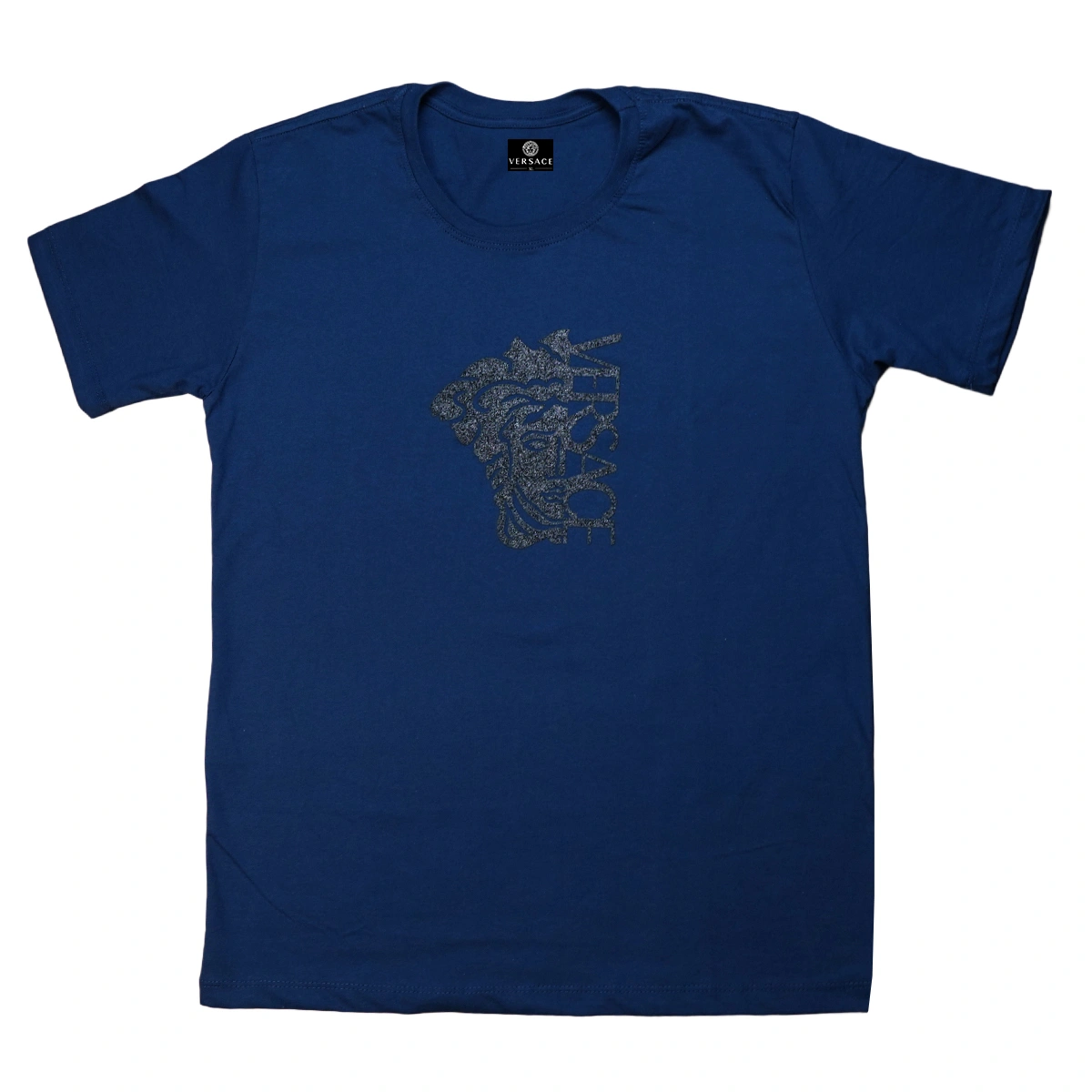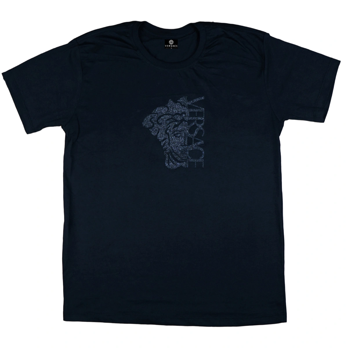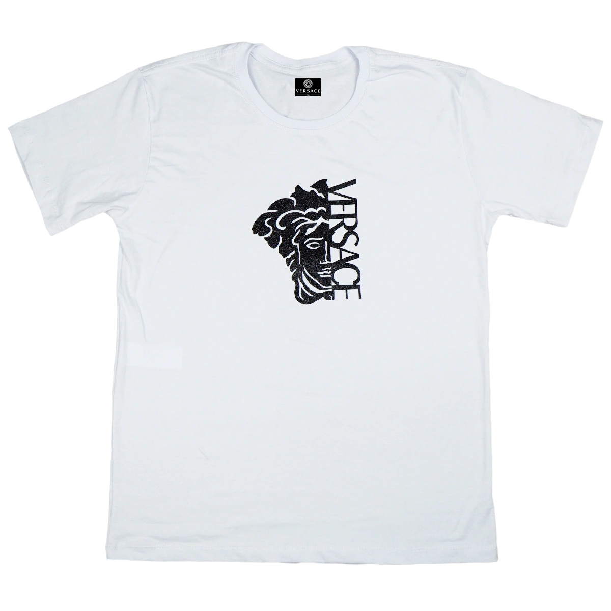 A camiseta apresenta fixado na parte frontal, esse patch com detalhes brilhantes que leva o logo da Versace juntamente com o icônico desenho da Medusa, símbolo da marca.