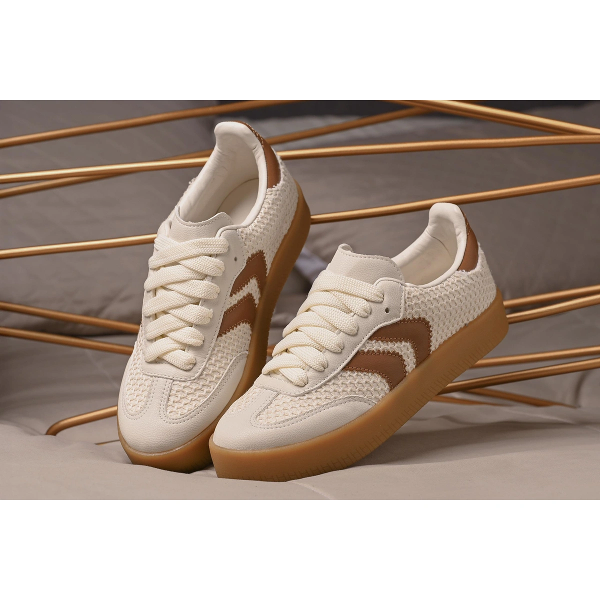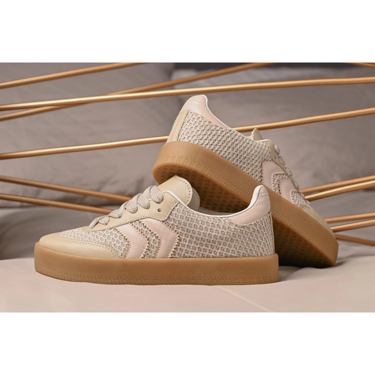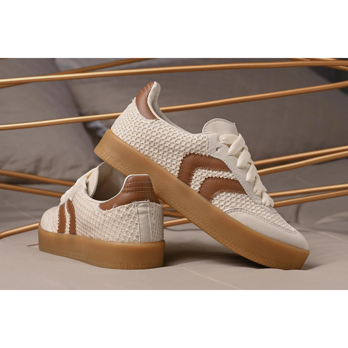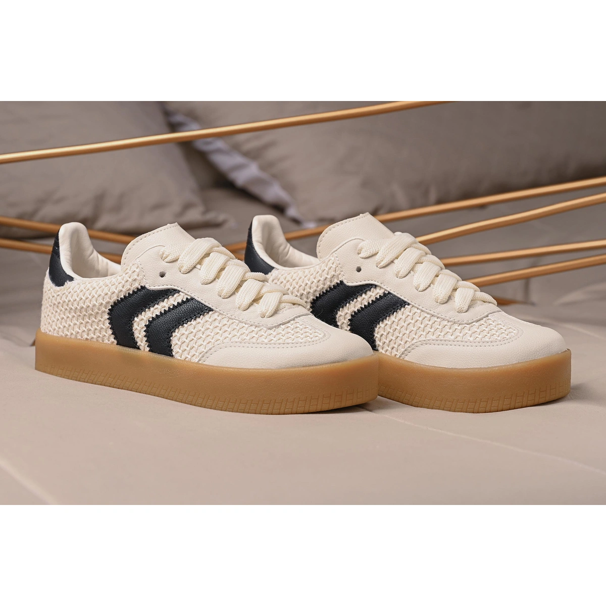 Detalhes: Tiras com sombra metálica + acabamentos sintéticos
