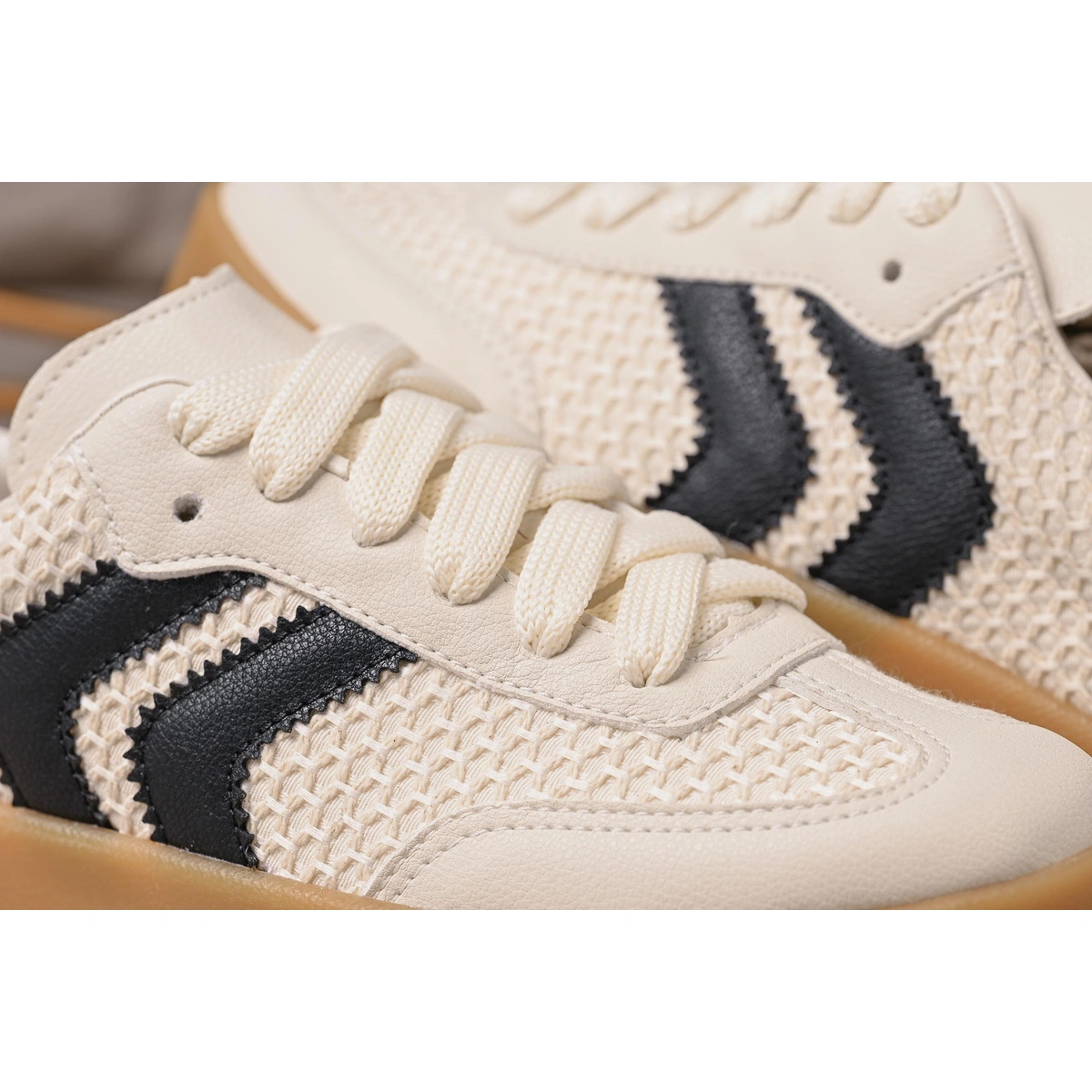 Cabedal: Tecido de tricô com detalhe desfiado