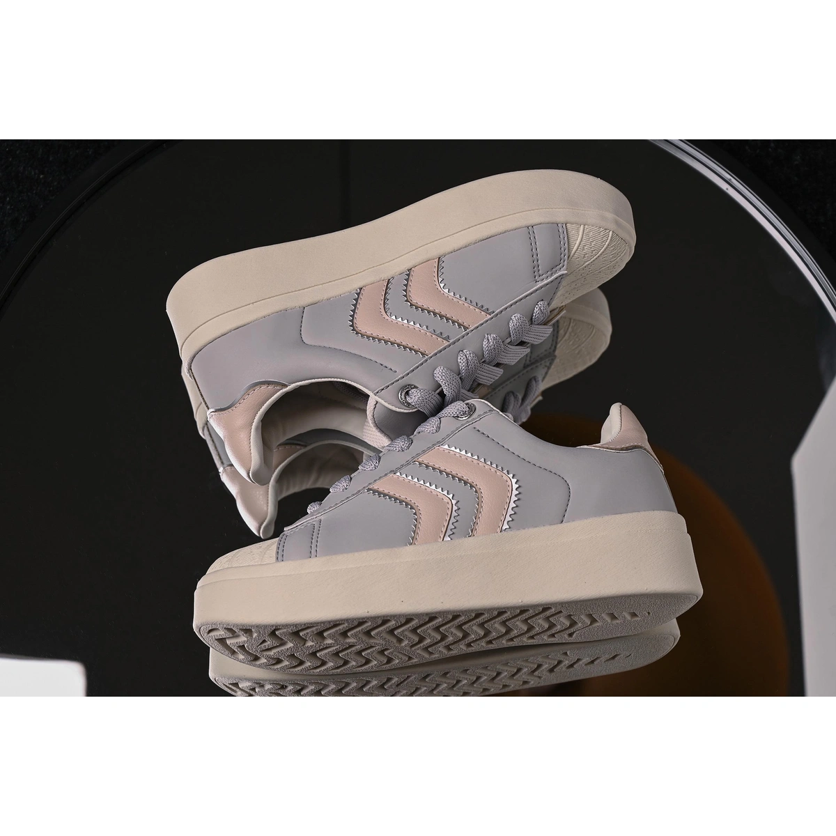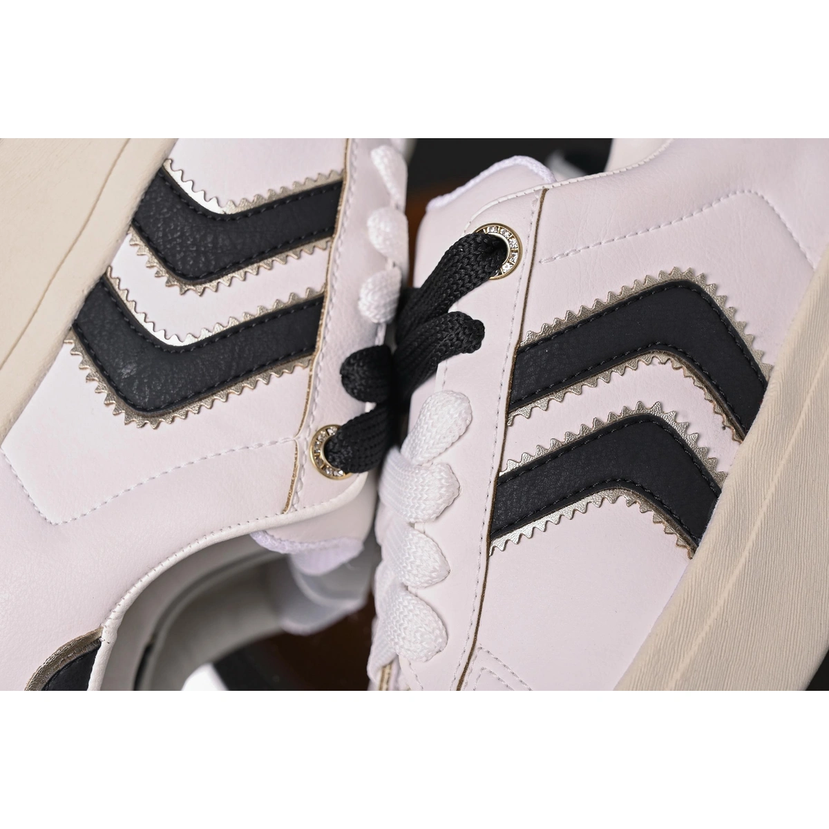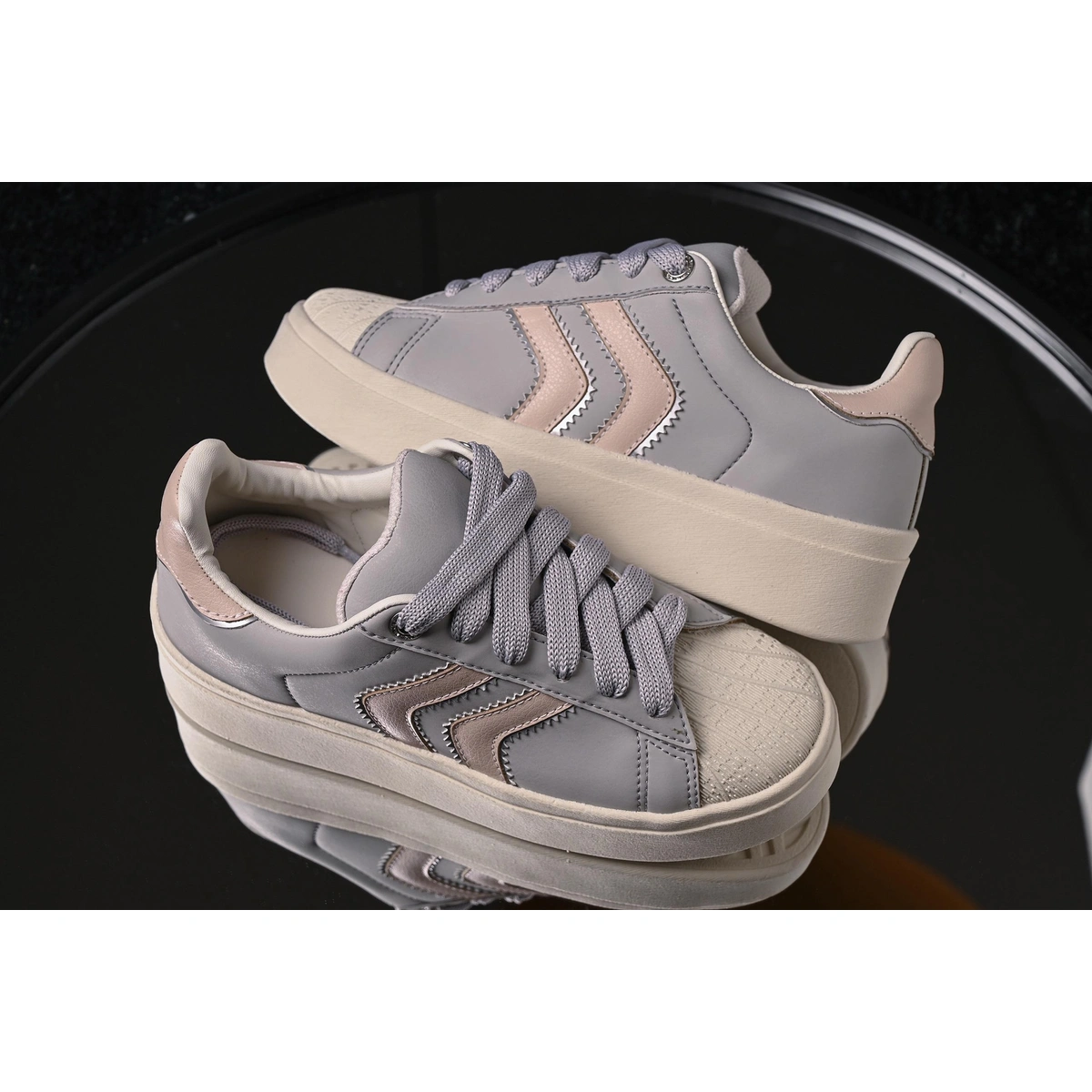 Cabedal: Sintético com tiras em sombra metálica