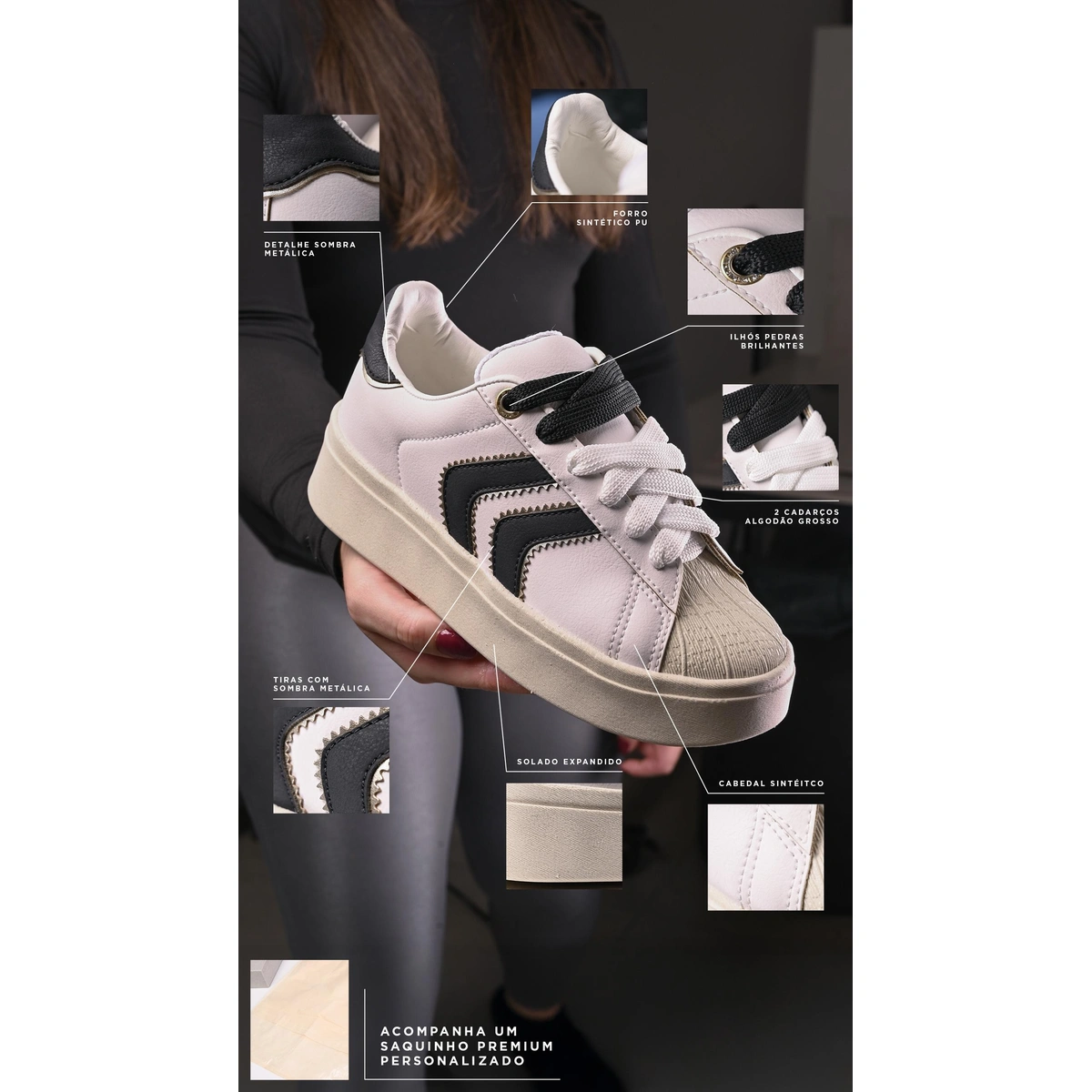 O modelo acompanha 2 opções de cadarços em algodão grosso, permitindo variar o visual de acordo com seu estilo. Além disso, acompanha um saquinho premium personalizado, agregando praticidade e exclusividade ao produto.